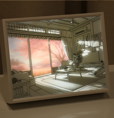 A mood lamp capturing the essence of sunlight. When the light is off, it becomes an interior frame. When the light is on, it transforms into an emotional mood lamp.