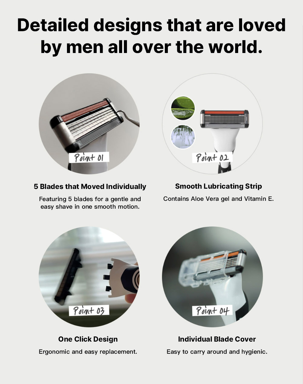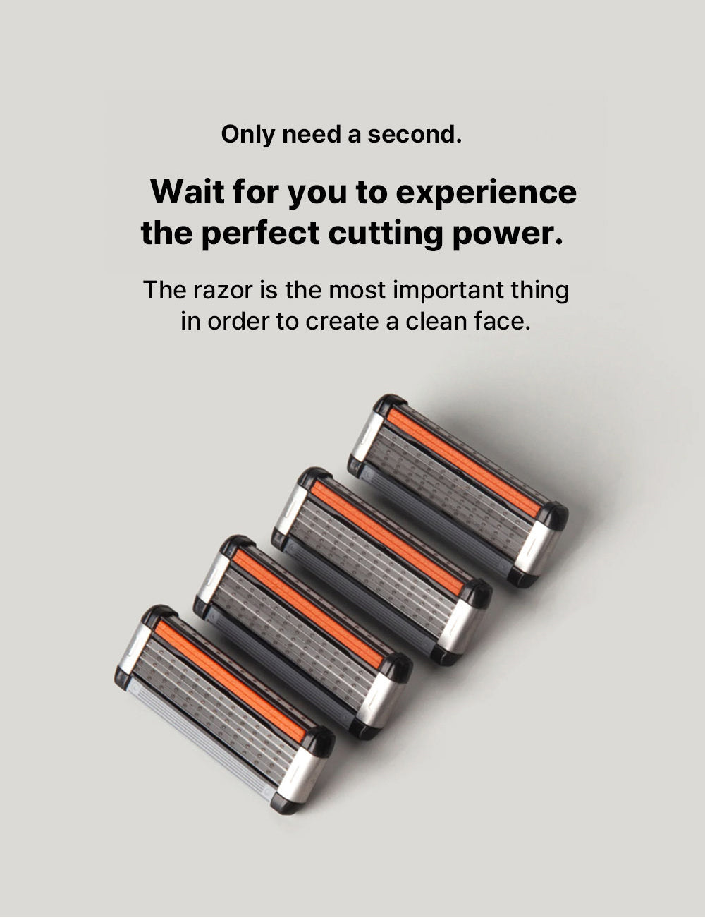 Fuction: Cica Shaving Gel - calms and soothes the skin. Reduces friction between the blade and the face and lower down the risk of scratching. 5-Blade Razor - shave the facial hair.