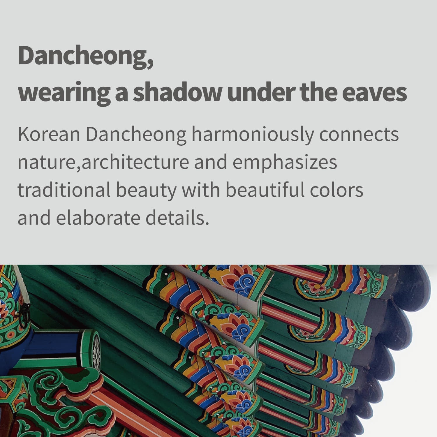 - Dancheong is a traditional pattern painted in vibrant colors on Korean wooden buildings.