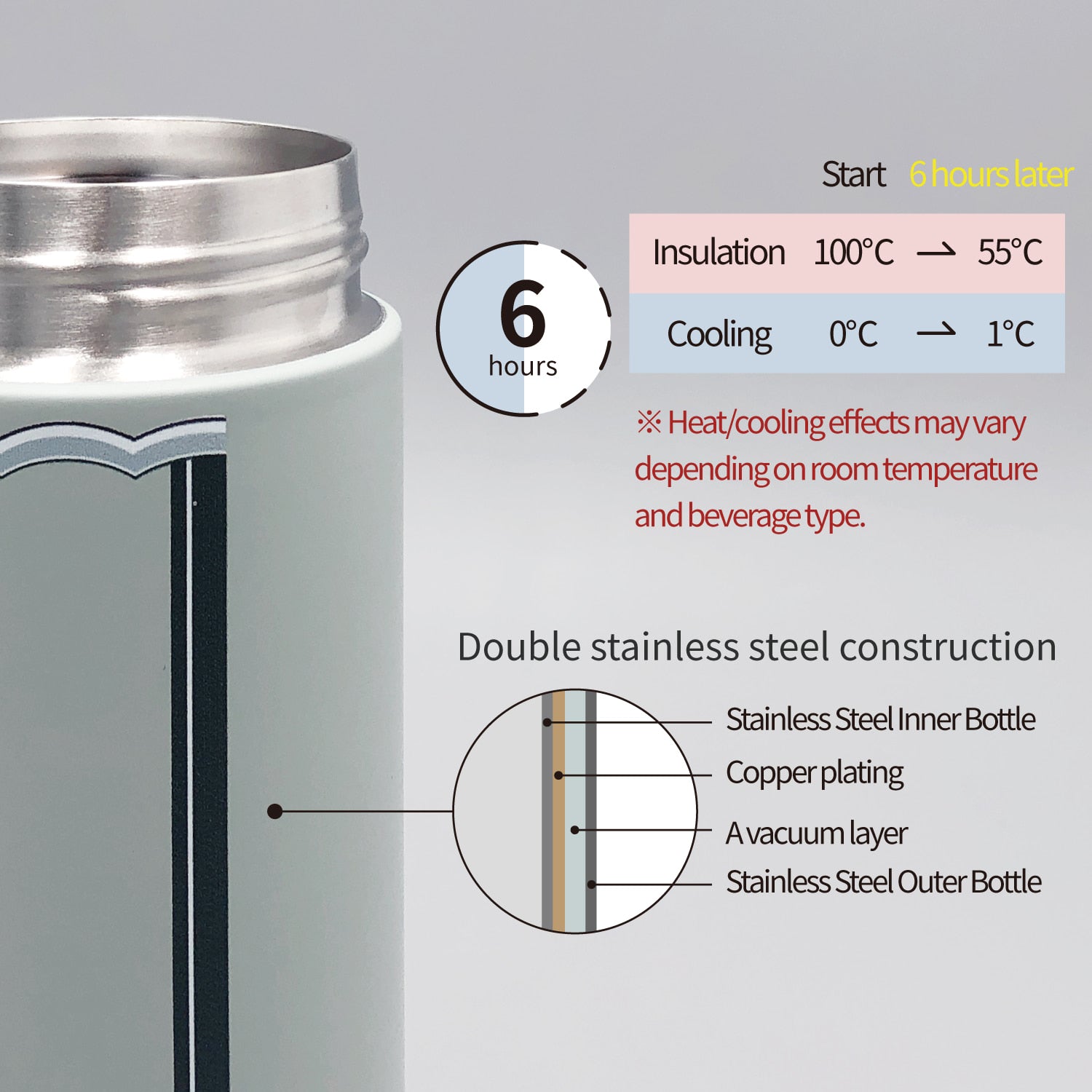 - Stainless steel double-wall vacuum construction keeps drinks hot or cold for up to 6 hours.