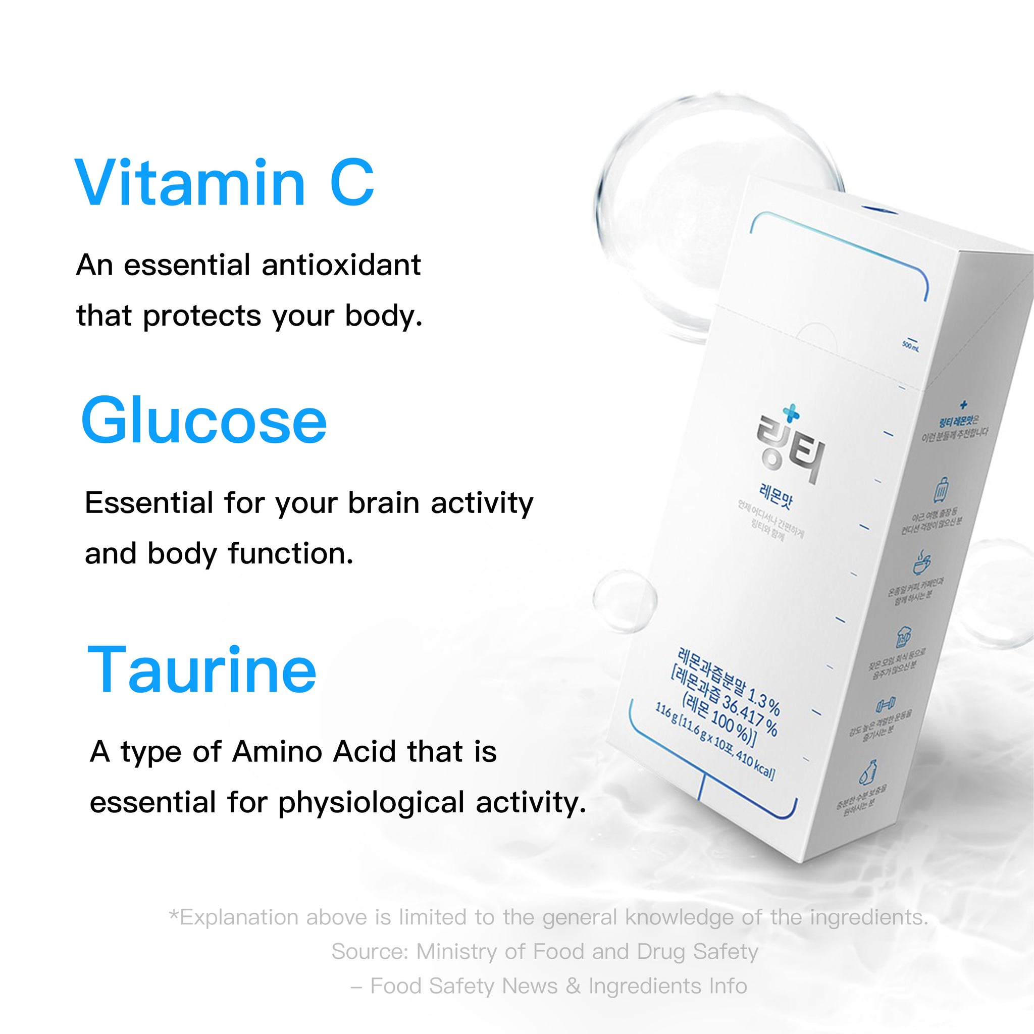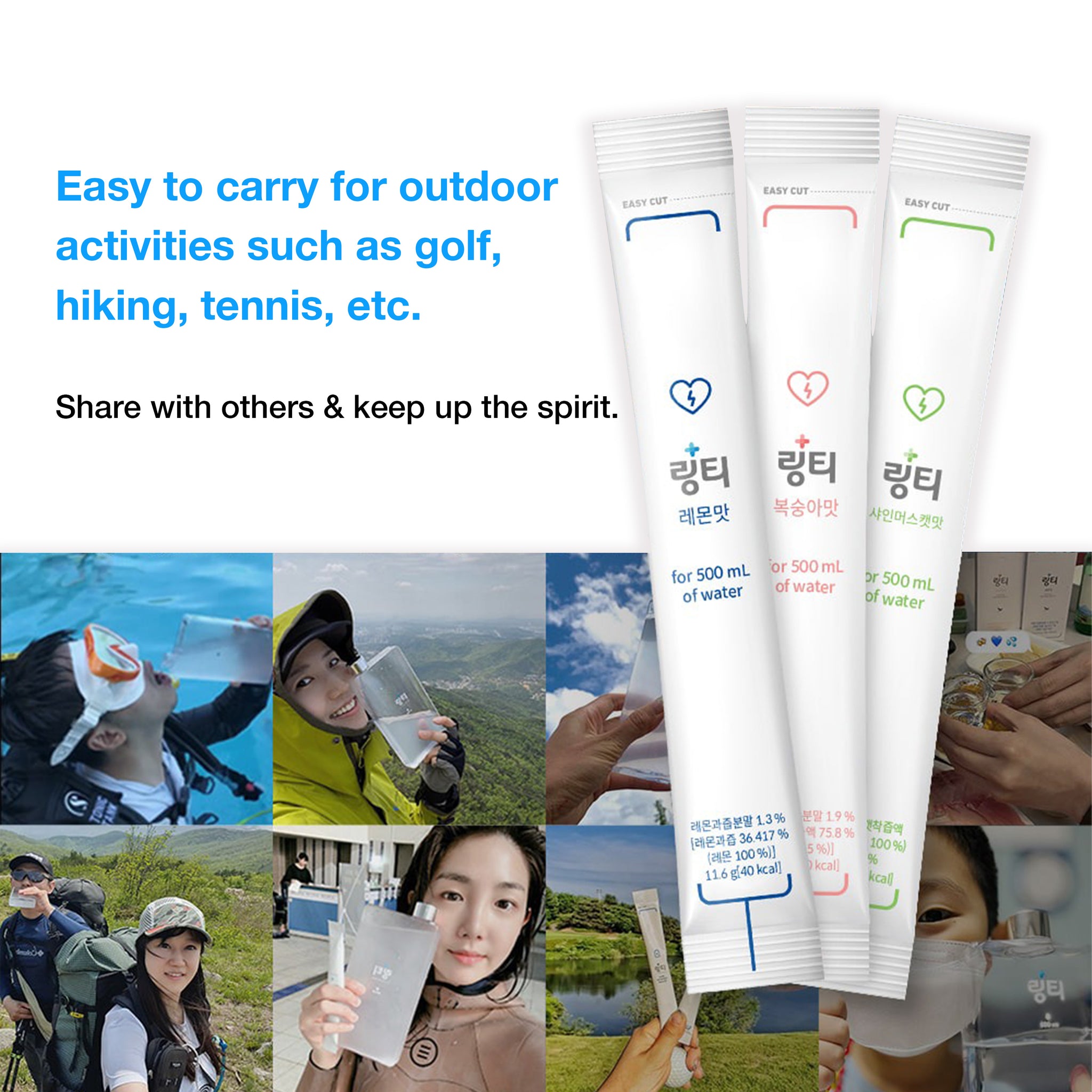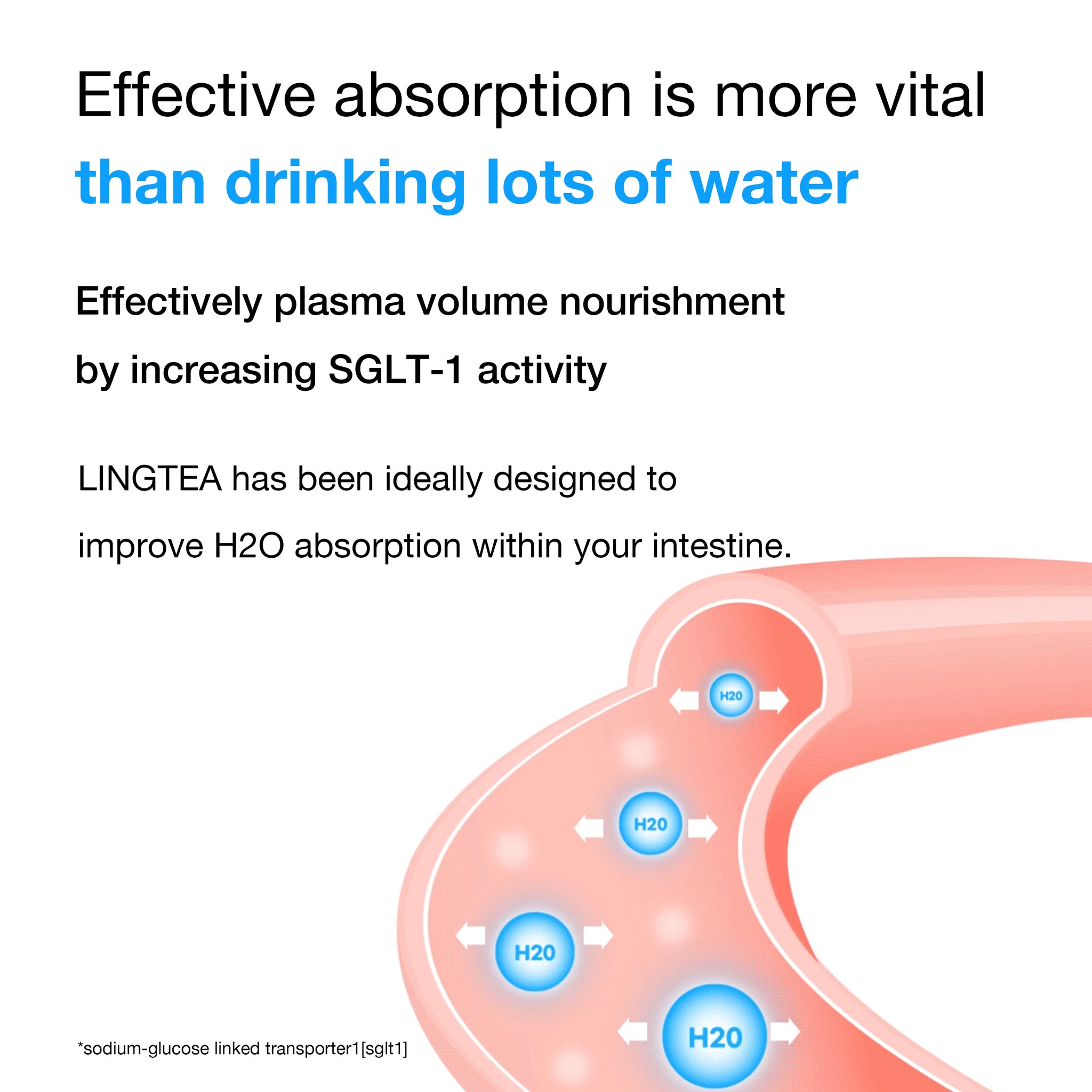 military physicians. LINGTEA improves intestinal water absorption, transports proteins and hydrates two times faster. Infused with Glucose, Vitamin C & B and Taurine to boost extra energy and get rid of exhaustion quickly. 3 fruity and refreshing flavors that you can consistently enjoy. Easy-to-carry convenient drink mix packets that you can take in anytime, anywhere.