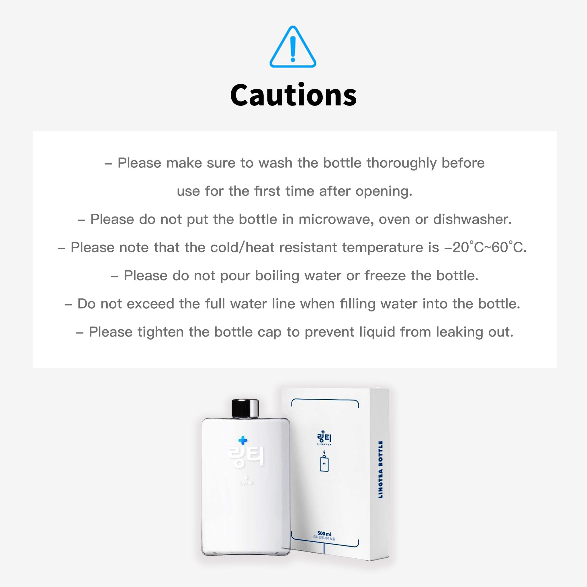 - Cold/heat resistant temperature is -20°C~60°C. Please do not pour boiling water or freeze the bottle.